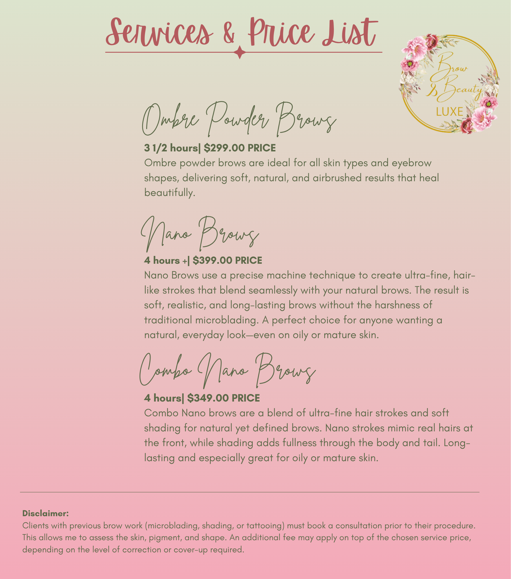To book an annual touch-up, you must have previously had your brows done at Brow & Beauty LUXE. If you’ve had your brows done elsewhere, you will not be eligible. Please send photos for eligibility first; once approved, you can proceed with booking a new appointment.